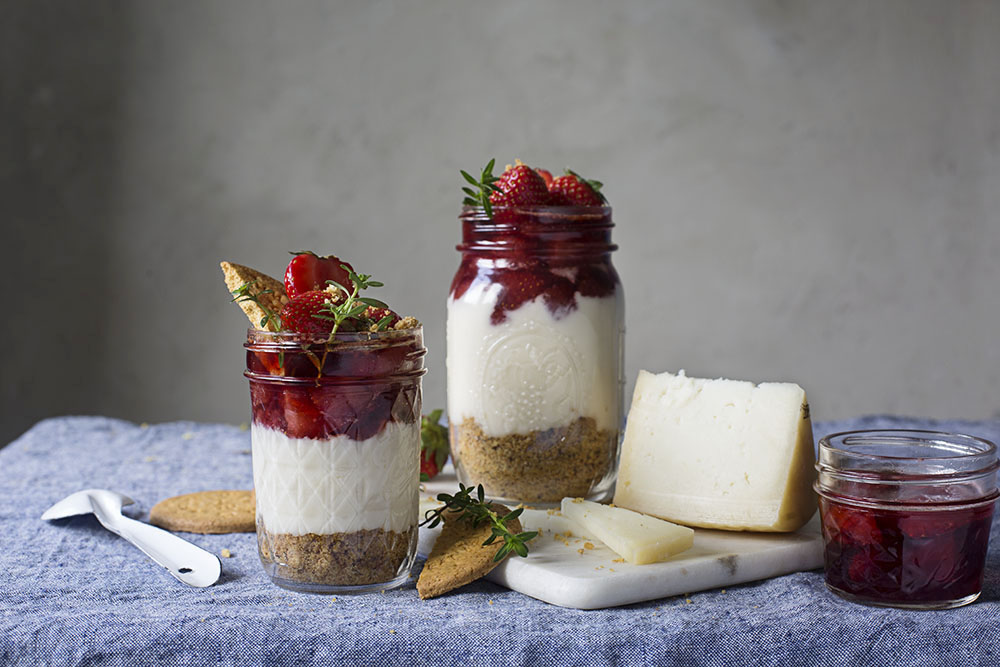 5. Servir con unas fresas naturales, unas cuñas de galleta y espolvoreado con más migas de galleta. El contraste del sabor del queso Idiazabal, con el dulzor de la galleta y la ligera acidez de la fresa, es adictivo.