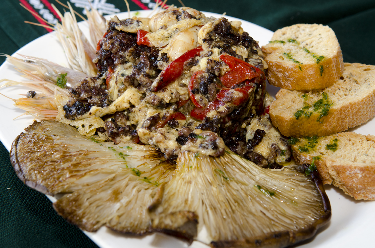 Euskal Txerri odoloste-nahaskia ganba eta piper gorri erreekin