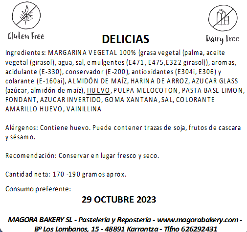 Osagaiak: Landare-margarina % 100 (landare-koipea (palma, landare-olioa (ekilorea), ura, gatza, emulgenteak (E471, E475, E322 ekilorea)), aromak, azidolanteak (E-330), kontserbatzailea (E-200), antioxidatzaileak (E304i, E306) eta koloratzailea (E-160ai), arto-almidoia, arroz-irina, glass azukrea (azukrea, arto-almidoia), arrautza, melokotoi-mamia, limoi-orea, fondant, azukre alderantzikatua, goma xantana, gatza, arrautza-koloratzaile horia, banillina.